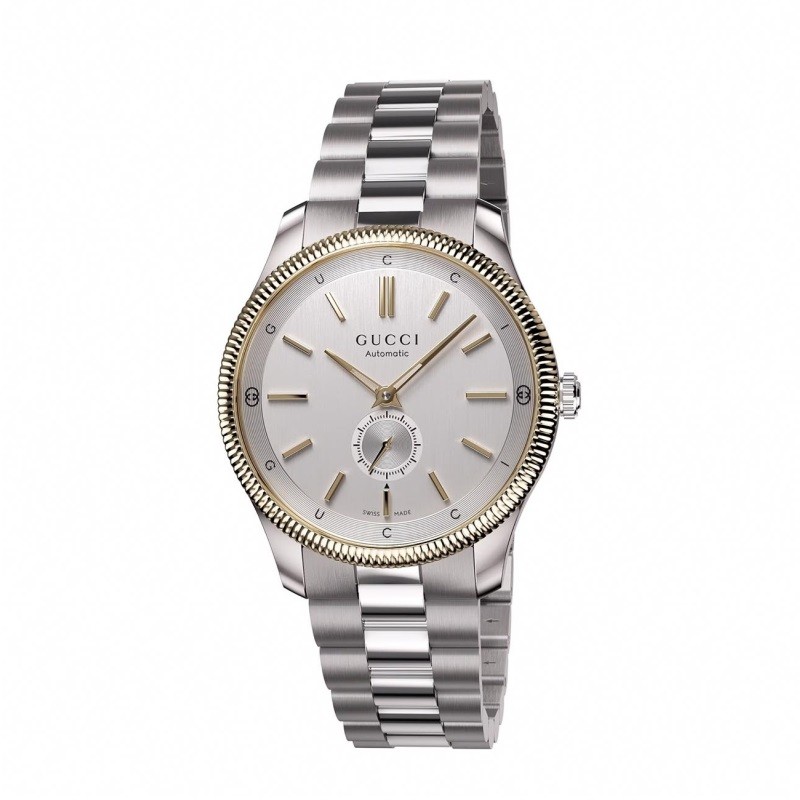 The season's polished look extends to watches and jewelry, including the G-Timeless collection. The round watch spotlights a sleek dial finish with subtle expressions of the Interlocking G, Gucci lettering, and signature motifs. Finished with a steel bracelet, the accessory is enriched with a small seconds display. 40 mm stainless steel case with gold-plated bezel Silver dial with Interlocking G and Gucci lettering Stainless steel bracelet Sapphire glass with anti-reflecting coating 5 ATM (50 meters/164 feet) Quartz movement Swiss Made Wrist size from 4.7" to 7.7".